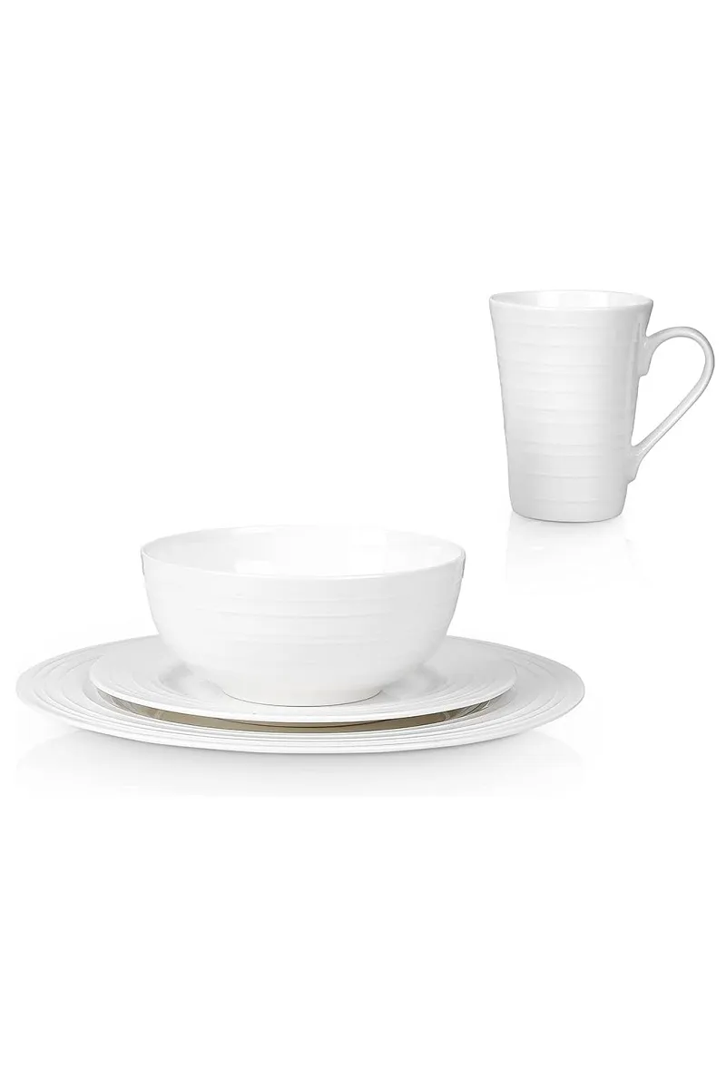 Servicio completo para 4 invitados: este juego de platos de 16 piezas incluye cuatro platos llanos de 10.5 pulgadas, cuatro platos de ensalada de 8 pulgadas, cuatro cuencos de sopa de 6 pulgadas y cuatro de 13 onzas. tazas: perfectamente divididas para cenas diarias o anfitriones.